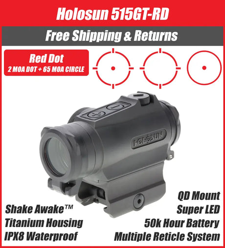 $529.99Unit price /UnavailableVery low stock (2 units)Holosun 515GT Red 2MOA Dot with 65MOA Circle Titanium QD Mount - HE515GT-RD