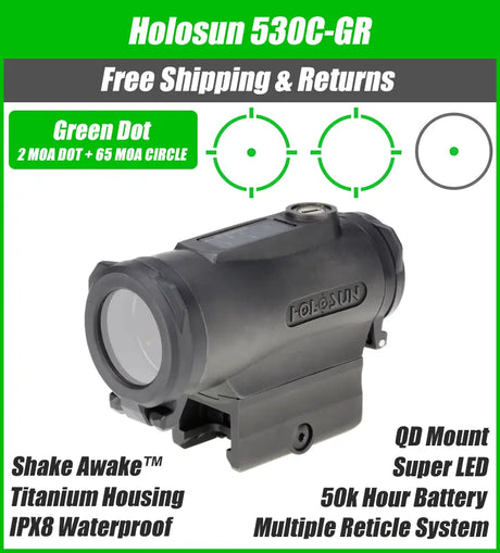 $499.99Unit price /UnavailableVery low stock (1 unit)Holosun 530C Green Dot 2MOA Dot with 65MOA Circle QD Titanium Solar - HE530C-GR