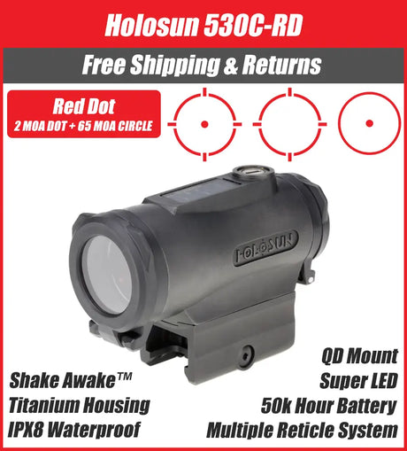 $515.00Unit price /UnavailableIn stock (110 units)Holosun 530C Red Dot 2MOA Dot with 65MOA Circle Solar Titanium QR Mount - HE530C-RD