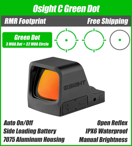 $229.99Unit price /UnavailableVery low stock (1 unit)Osight C Green Dot, 32 MOA Circle + 3 MOA Dot, Side-Loading Battery, RMR Footprint
