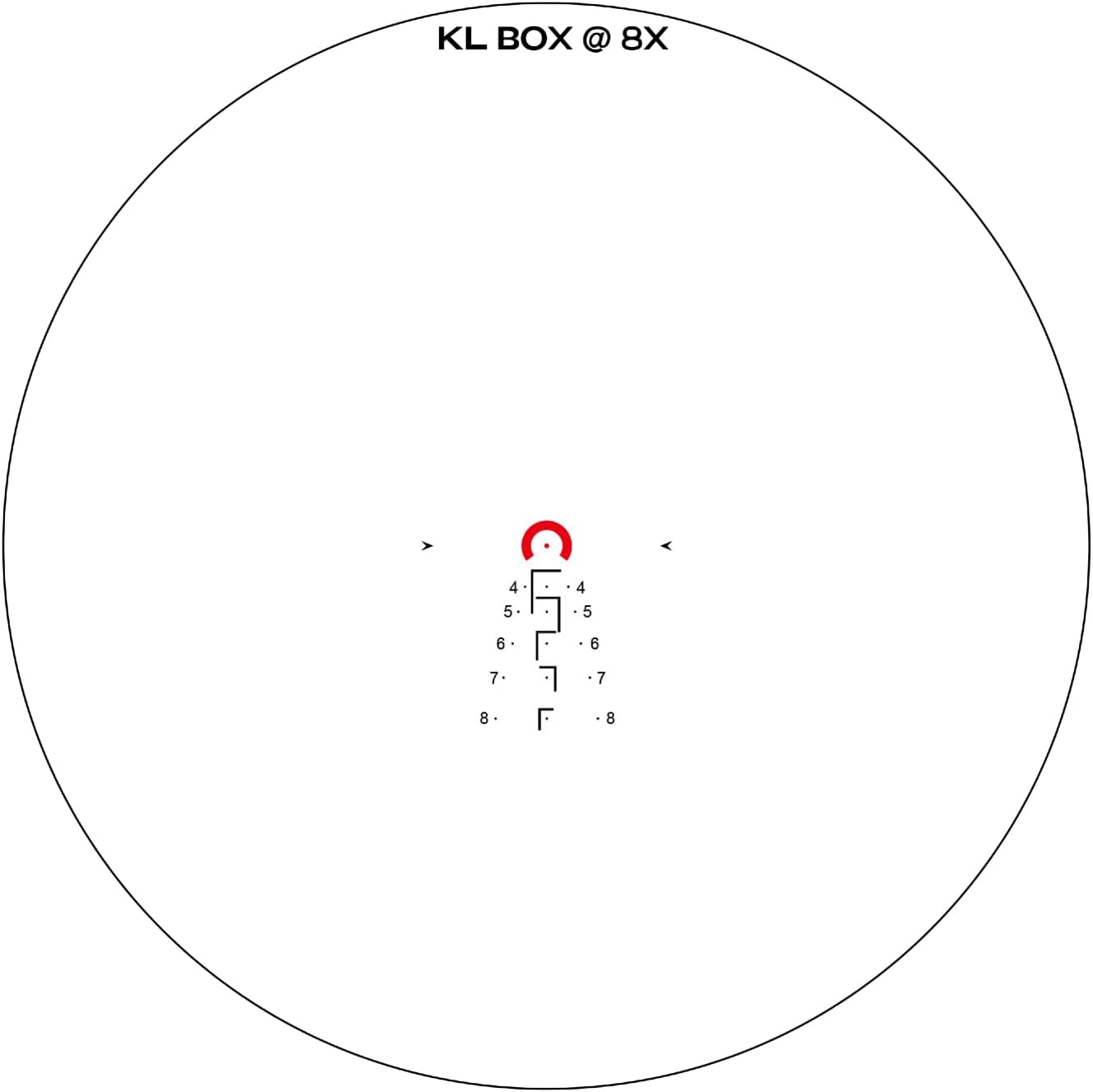 - KL Box Reticle: The EP8 features the innovative KL Box reticle (short for "Known Length"), a patent-pending BDC (Bullet Drop Compensation) design. This intuitive reticle is specifically engineered to enhance your effectiveness in high-stress environments.The outside numbers of the KL Box reticle extend diagonally below the centerline, correlating to distances in yards. This provides you with quick and accurate distance estimation, essential for precision shooting.