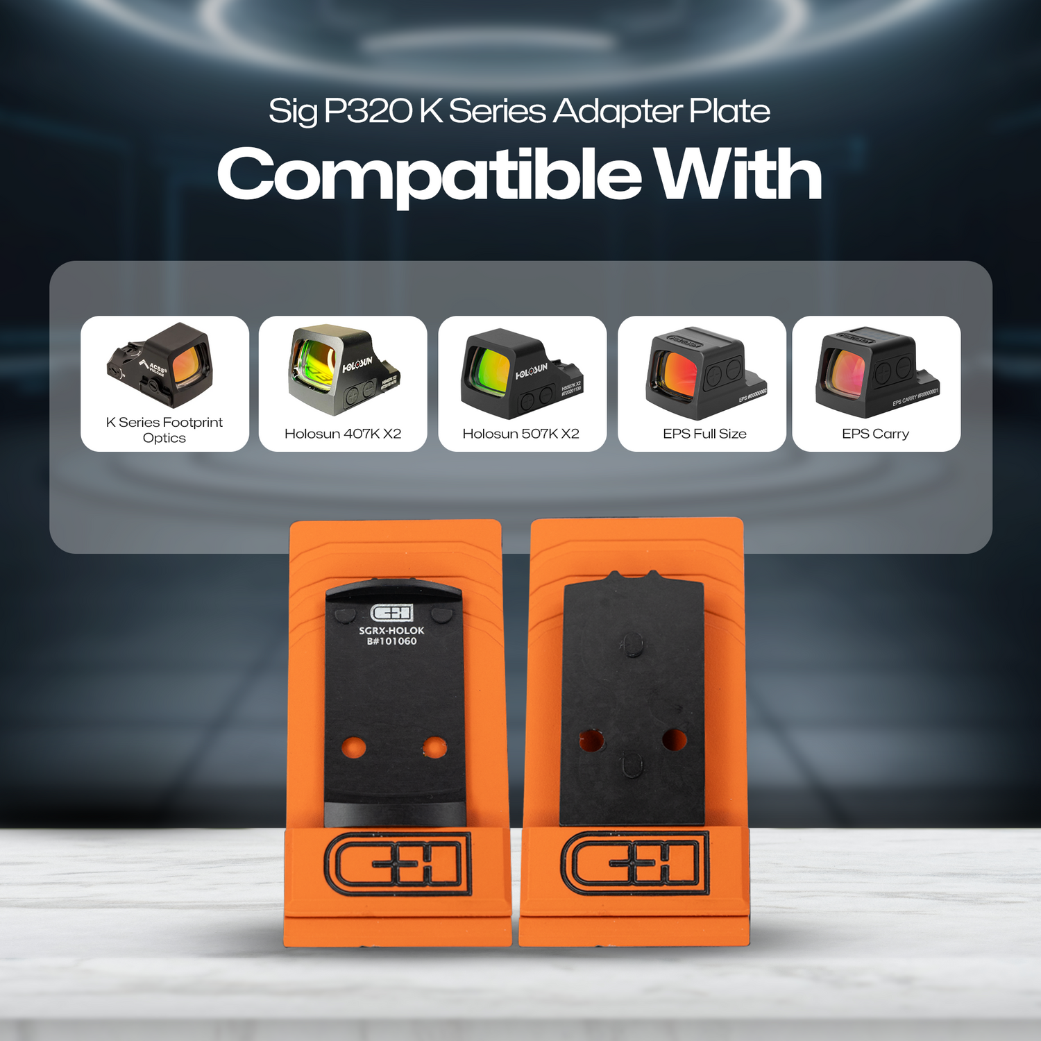 This CHPWS adapter plate will let you mount a Holosun "K" series footprint optic like the 407K, 507K, EPS, or EPS Carry to your Sig P320 with Romeo 1 Pro cut slide and with or without rear dovetails attached.