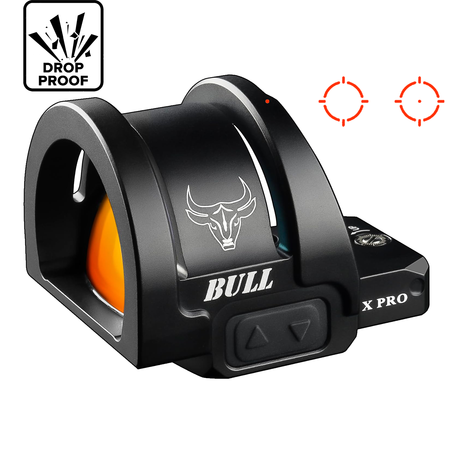 - The BULL X PRO red dot is DROP TESTED and deemed DROP PROOF for use on pistols. While the optic has survived direct optic down drops onto solid rock on full-sized rifles (AK-47). It is conservatively rated DROP PROOF for 6' drops, optic down, on 45oz pistols, onto concrete that you might find on the street.