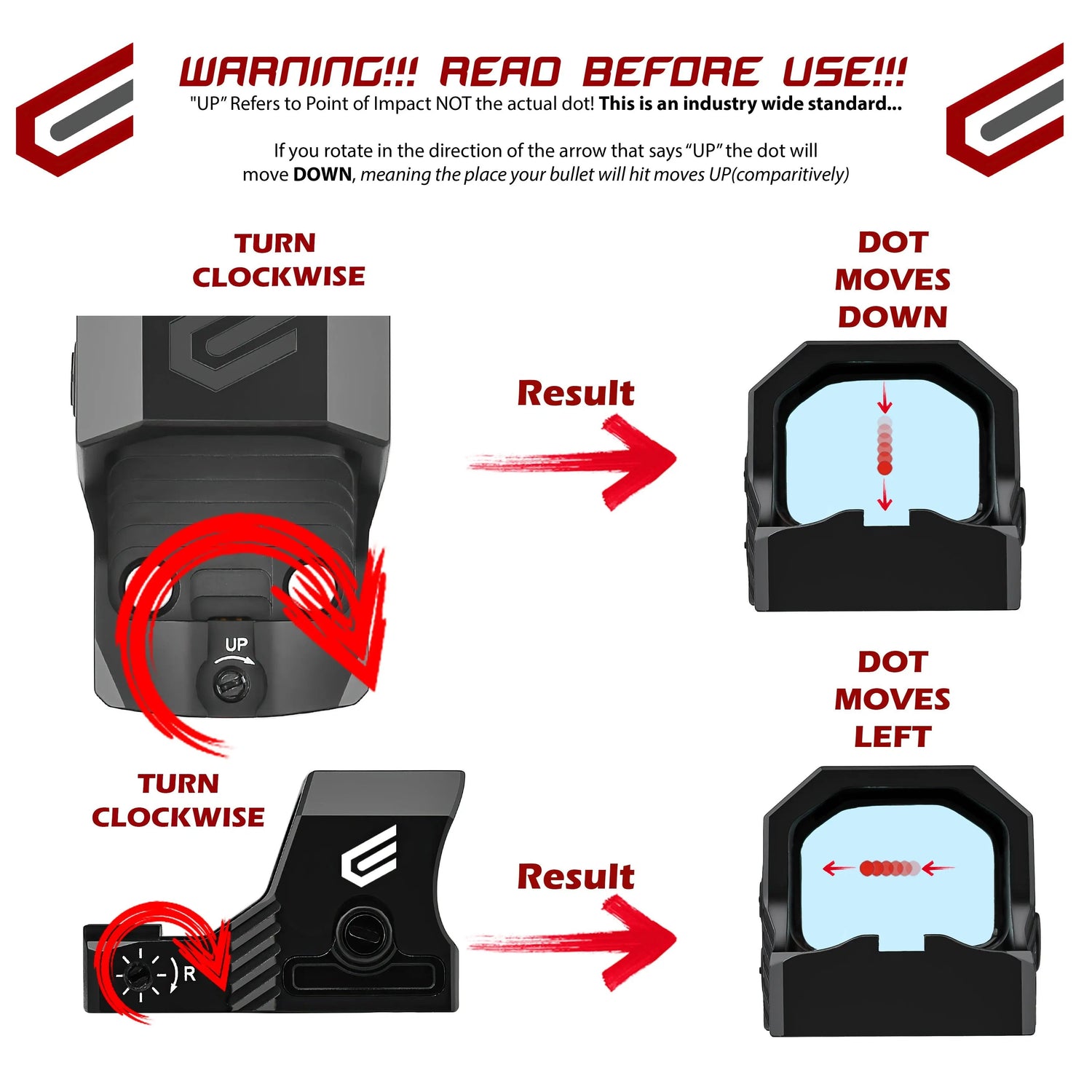 The Cyelee CAT PRO red dot Micro Red Dot Sight is an ultra-compact open-reflex sight, designed for compact and subcompact pistols. It offers robust reliability, purpose-built for duty and professional use, and ready for any environment. Improved target acquisition, intuitive controls, and innovative electronics allow you to defend yourself, and others, confidently. The CAT PRO red dot is easily installed on optics-ready slides or mounts compatible with Shield RMSc or JPoint footprints. It is equipped with advanced MDS Mode(Motion Deactivated Standby) technology, to ensure it's also ready to go in the split second you are! While on, the sight automatically sleeps after 4 minutes of non-activity but quickly comes back to life as soon as it is moved. Its high-quality potted and waterproof electronics, and our own "Super LED" ensure up to 50,000-hours battery runtime.