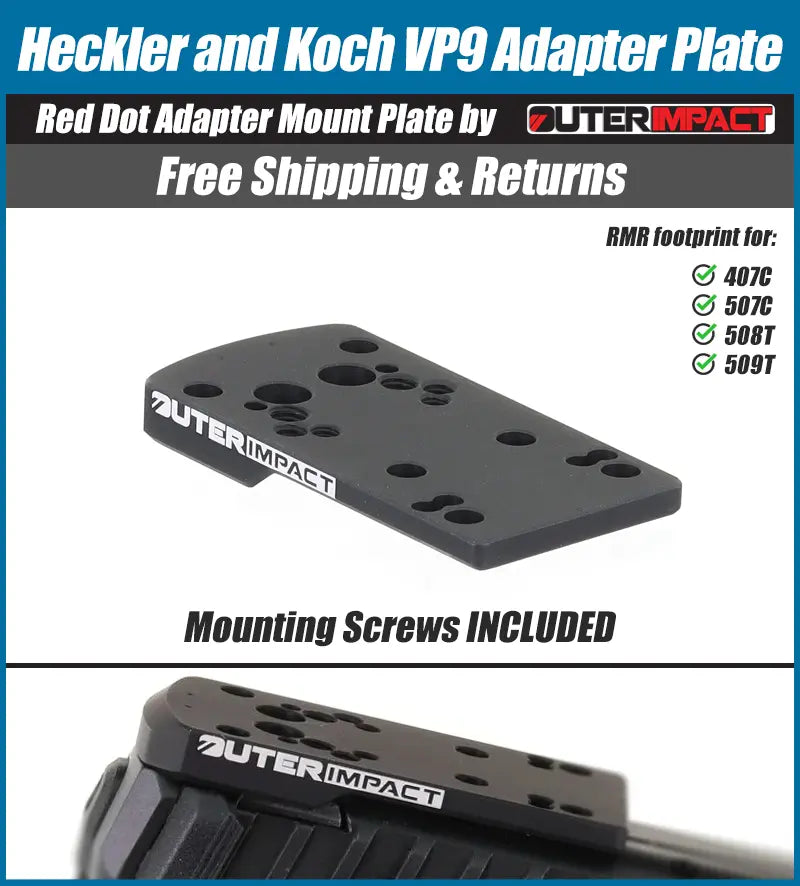 Heckler and Koch VP9 Pistol Red Dot Adapter Mount Plate - OuterImpact is backordered and will ship as soon as it is back in stock.