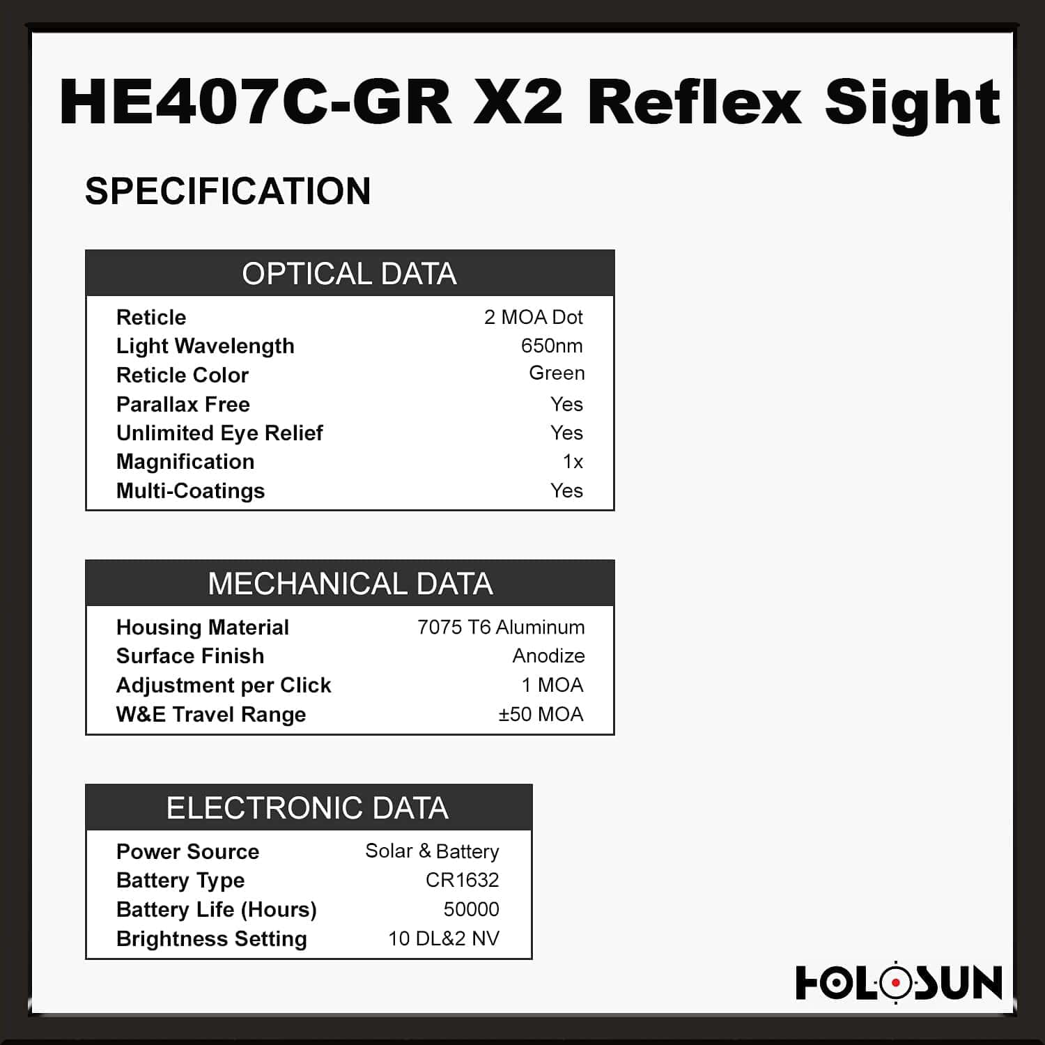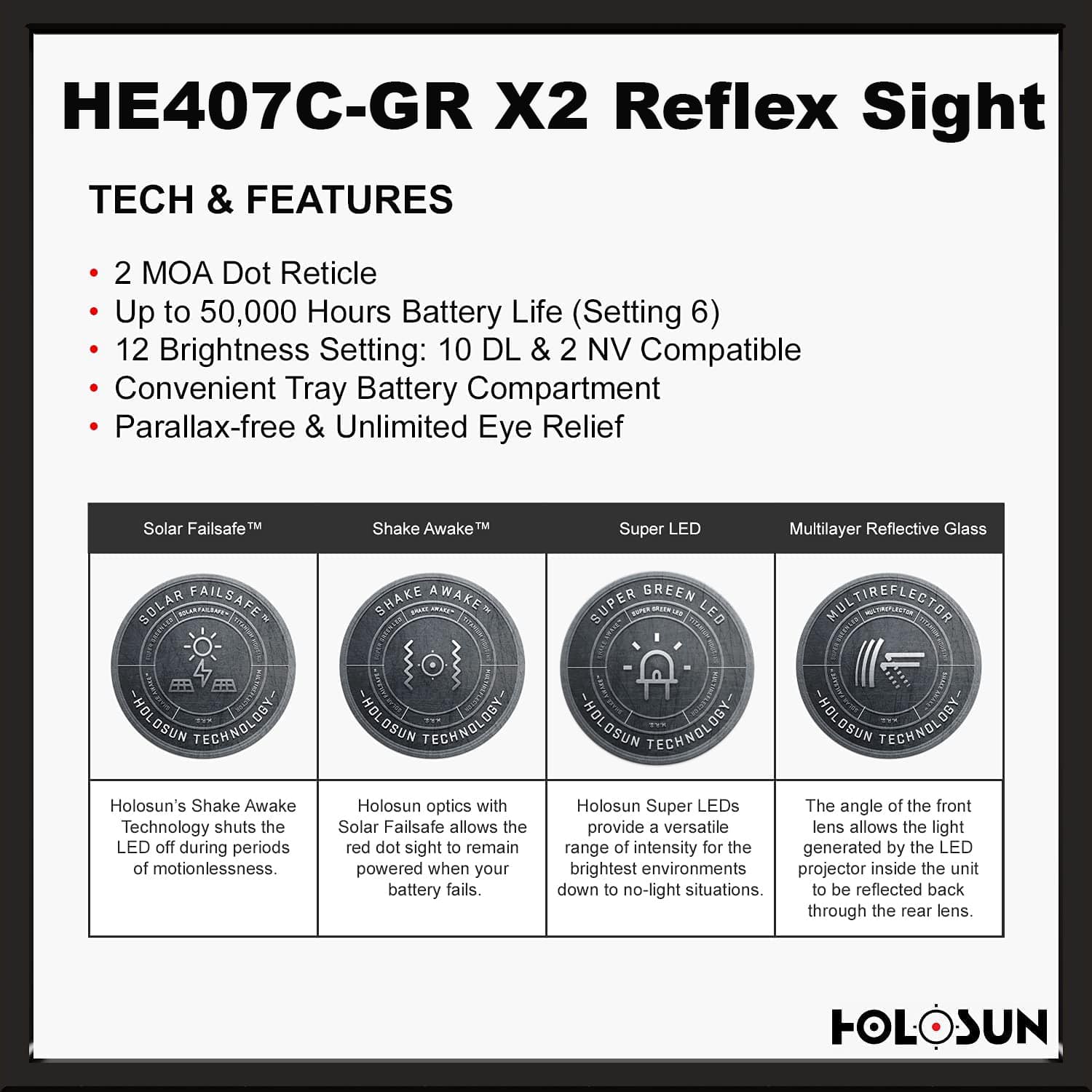Holosun 407C X2 2 MOA Green Dot, RMR Footprint, Side Battery, Solar Failsafe - HE407C-GR-X2