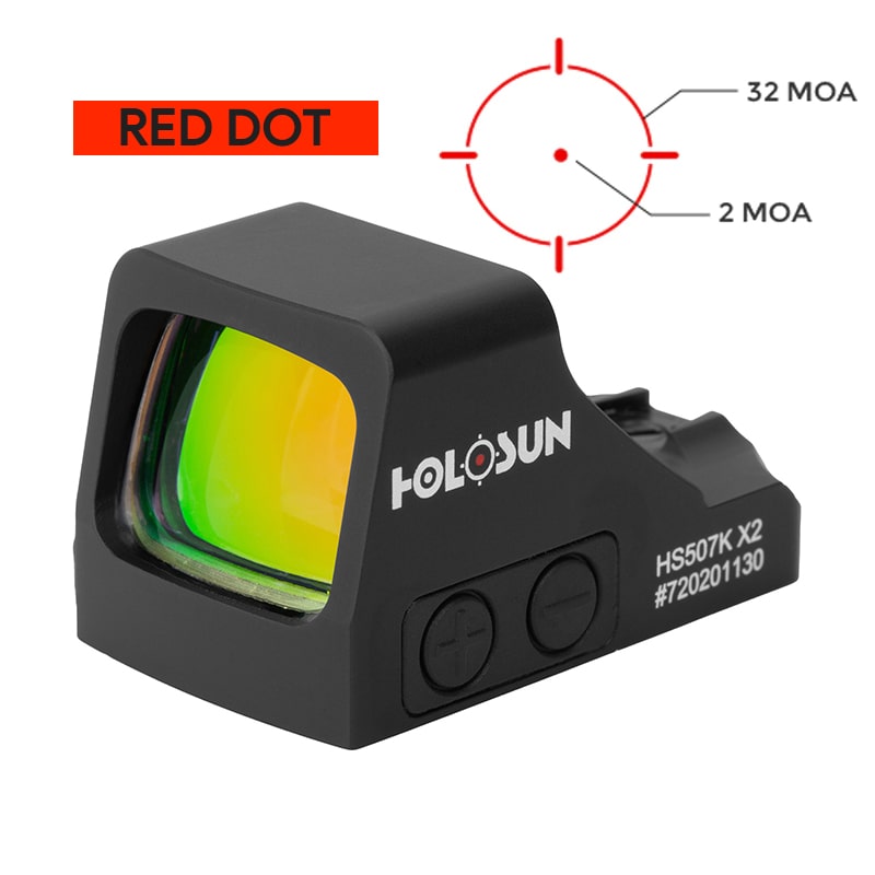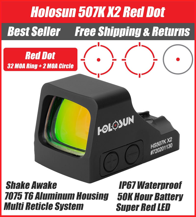 The Holosun 507K X2 is a micro pistol red dot sight from Holosun with an M.R.S. (multi reticle system) and a modified RMSc footprint a.k.a. K Series footprint. The MRS reticle gives you a 32 MOA outer ring, and a 2 MOA center dot. The larger outer ring makes “finding the dot” a bit easier, and the 2 MOA dot makes precision shots easier to achieve.