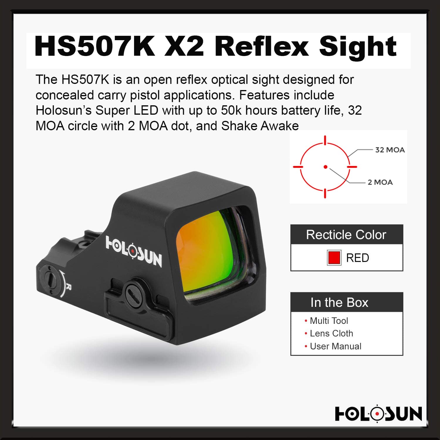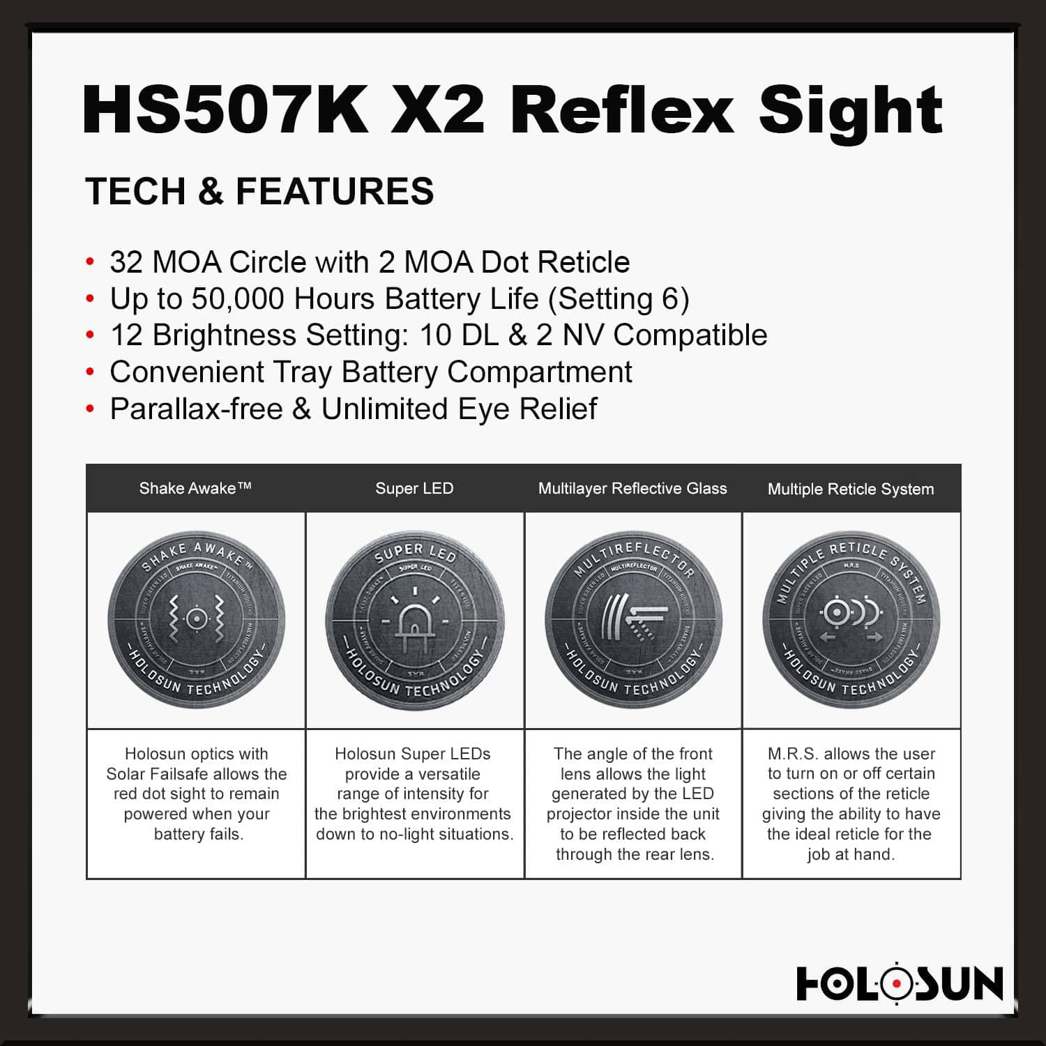 Holosun 507K X2 Red Dot, 32 MOA Ring & 2 MOA Red Dot, K Series Footprint (Modified RMSc), MRS Reticle, Side Battery - HS507K-X2