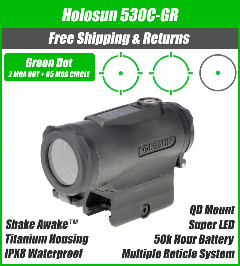 Holosun Technologies, 530C, Green Reticle, Black Finish, 2MOA Dot with 65MOA Circle, Quick Disconnect Mount, Fits 1913 Picatinny Rail, Titanium Housing, Three Different Reticles, Solar Failsafe, Shake Awake