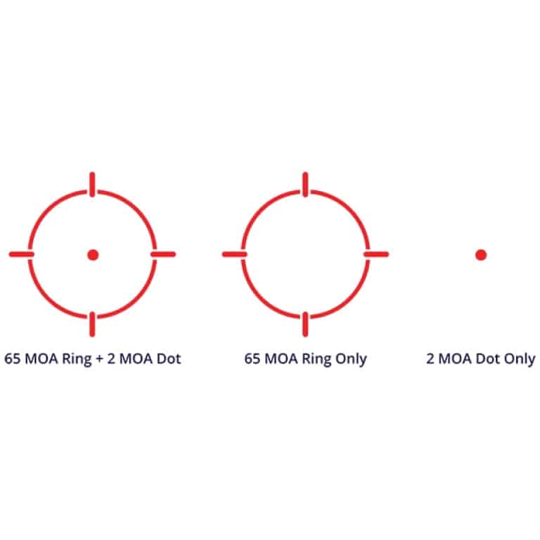 - User-configurable circle/dot & red dot reticles (2-MOA dot, 65-MOA ring + dot, 65-MOA ring only).