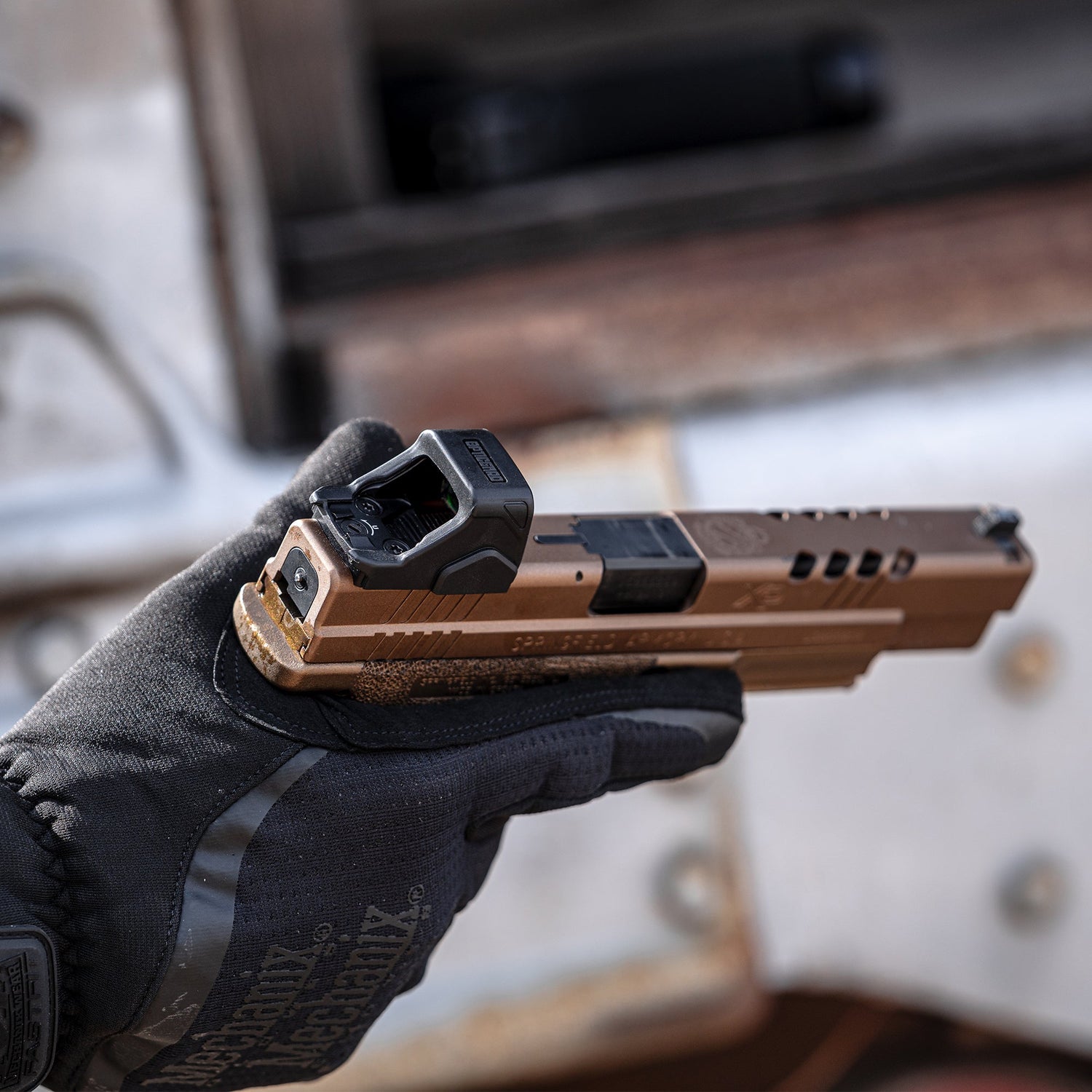 The OpticGard Scope cover for the Holosun® 507K-X2/407K-X2 offers protection against stray bullet casings and scratches. The intelligent cut allows the cover to fit most rear and suppressor sights. It also includes a detachable training lens which will allow you to use the red dot even in the sun or bright areas. Our scope covers are made from a material made from TPU (Thermoplastic Polyurethane) offering protection from abrasion. In addition, the fast and simple installation allows easy access to the buttons without removing the cover. Finally, the interlocking pins secures the cover so it won't fall off even with heavy recoil from handgun slides.