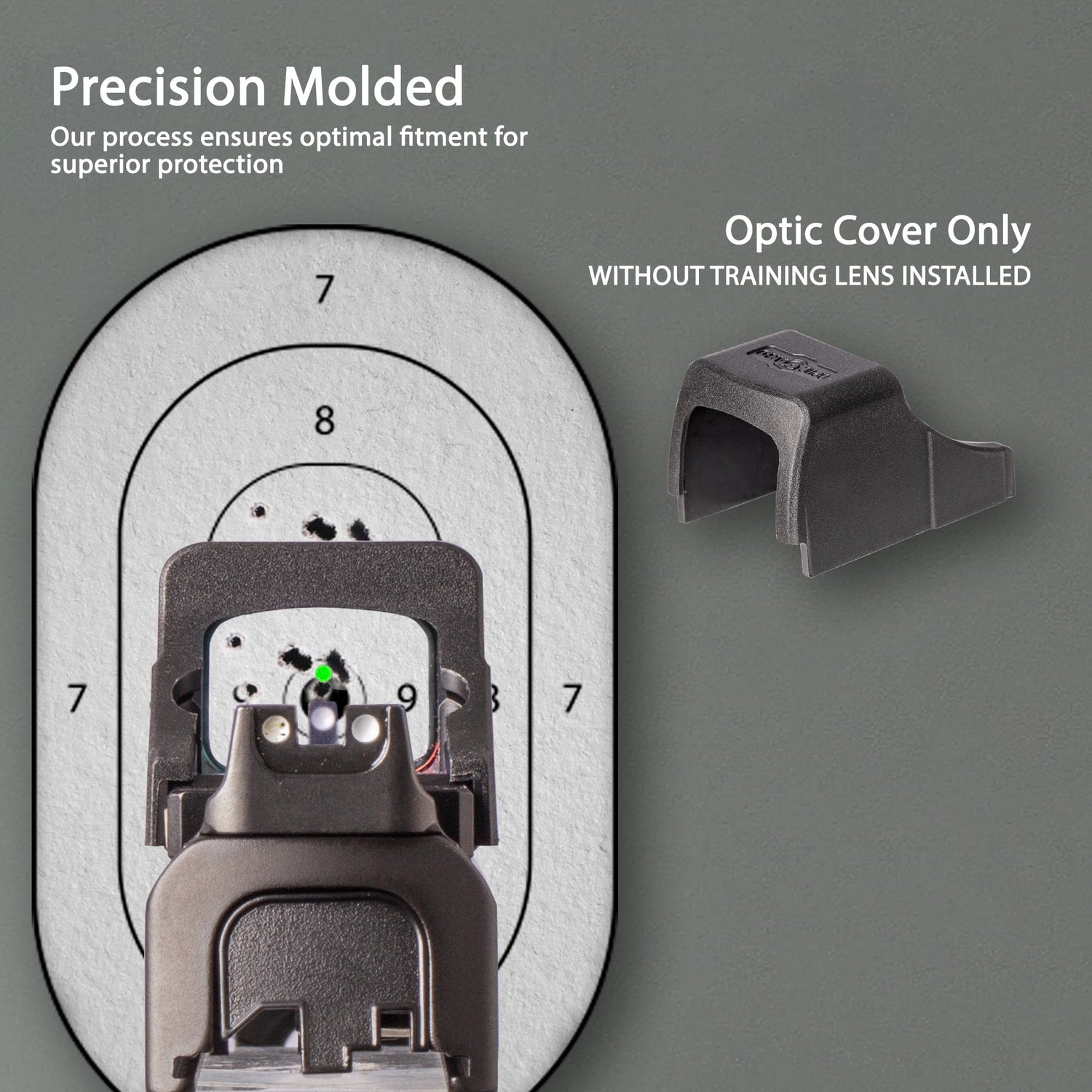 The OpticGard Scope cover for the Holosun® SCS MP2 offers protection against stray casings and scratches. The intelligent cut allows the cover to fit most rear and suppressor sights. It also includes a detachable training lens which will allow you to use the red dot even in the sun or bright areas. Our scope covers are made from a material made from TPU (Thermoplastic Polyurethane) offering protection from abrasion. In addition, the fast and simple installation allows easy access to the buttons without removing the cover. Finally, the interlocking pins secures the cover so it won't fall off even with heavy recoil from handgun slides.