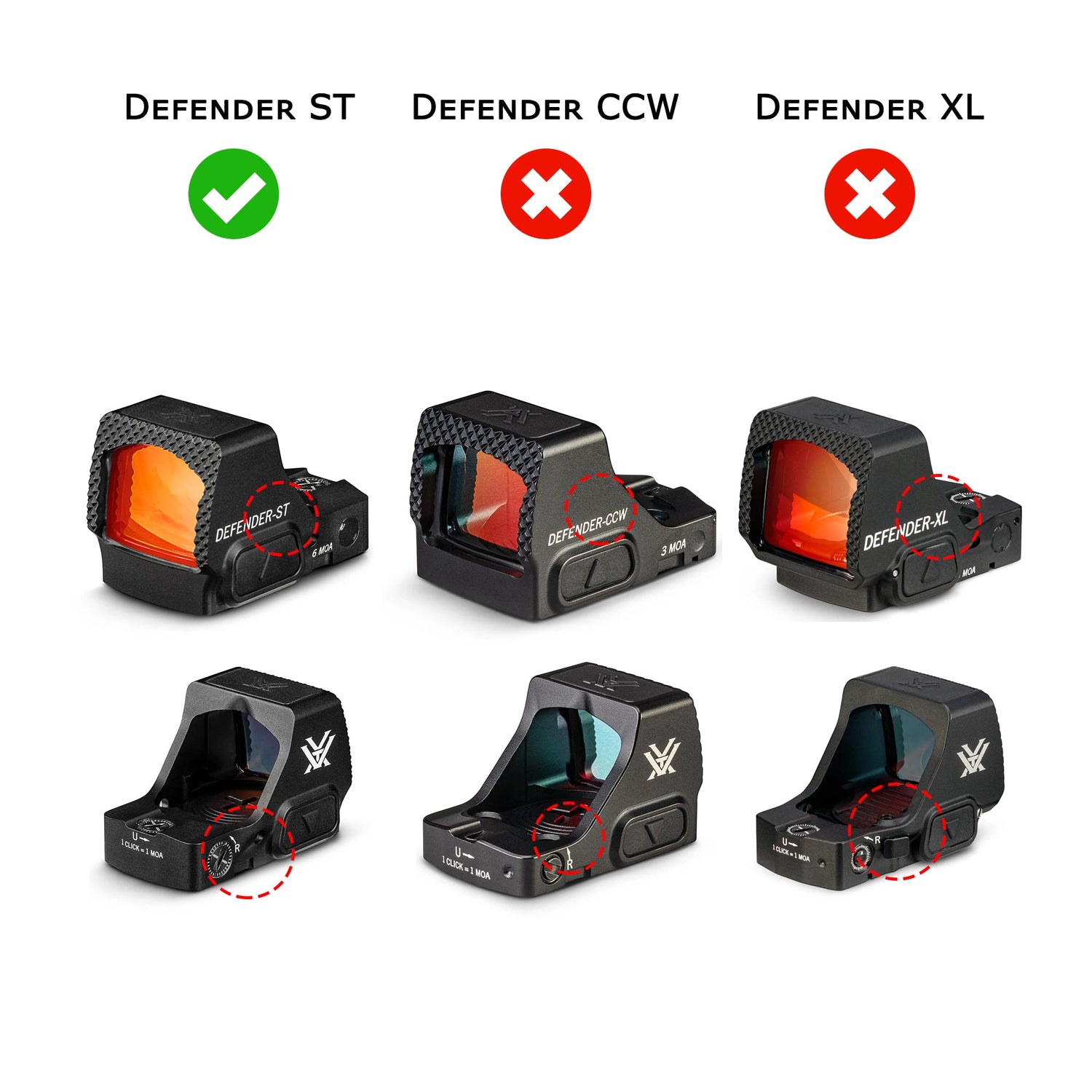 The OpticGard Scope cover for the Vortex® Defender ST offers protection against stray casings and scratches. The intelligent cut allows the cover to fit most rear and suppressor sights. It also includes a detachable training lens which will allow you to use the red dot even in the sun or bright areas. Our scope covers are made from a material made from TPU (Thermoplastic Polyurethane) offering protection from abrasion. In addition, the fast and simple installation allows easy access to the buttons without removing the cover. Finally, the interlocking pins secures the cover so it won't fall off even with heavy recoil from handgun slides.