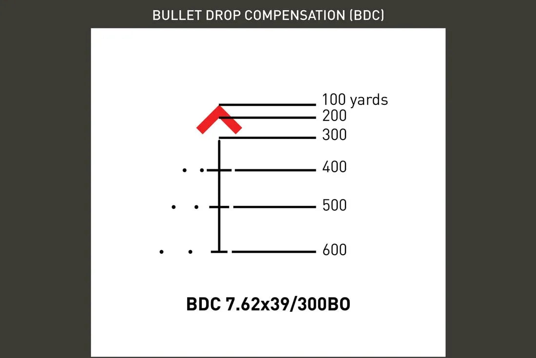 The patented ACSS® (Advanced Combined Sighting System) Raptor reticle enhances modern marksmanship by turning complex calculations into intuitive visual holdovers. The ACSS-RAPTOR-300BO/7.62x39-YP model is optimized for 7.62x39mm and .300 AAC Blackout ballistics.