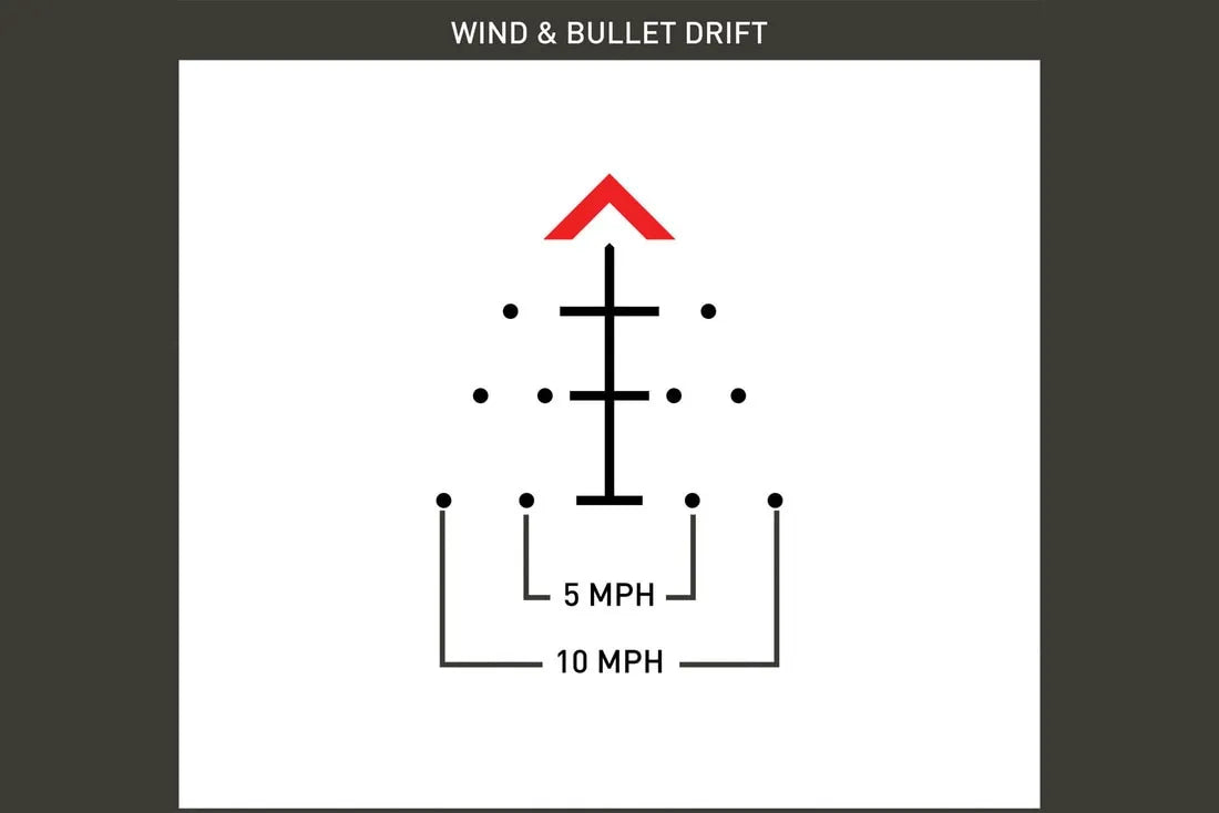 At close range, the bold outer horseshoe and precise center chevron enable fast, accurate targeting. For longer shots, the reticle features auto-ranging ballistic drop compensation and wind holds for 5 mph and 10 mph crosswinds—calibrated in 100-yard increments.