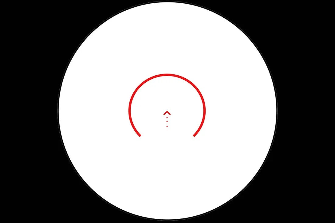 The ACSS CQB reticle features three BDC dots underneath the chevron, allowing an unprecedented 600 yards of bullet drop compensation for 7.62 NATO or 5.56 NATO calibers in a compact red dot sight. Auto ranging and wind leads are also incorporated into this smart reticle. A CQB horseshoe grabs the eye instantly for close quarters shooting and also approximates the spread pattern of 00 buckshot at 25 yards.