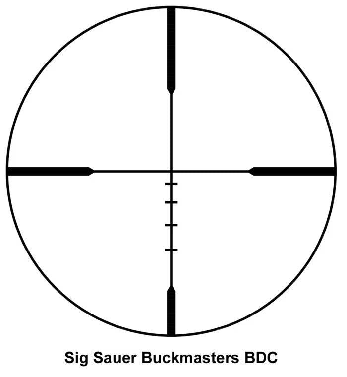 Track and drop big game in confidence with the Sig Sauer® Buckmasters™ Rifle Scope. Inspired by Jackie Bushman, this rifle scope features a custom Buckmasters Bullet Drop Compensation (BDC) reticle with holdover dots out to 500 yards for enhanced accuracy. Solid aluminum construction offers lightweight, yet durable performance, while capped adjustment turrets deliver precise elevation and windage adjustments. Fully-multicoated lenses ensure optimal clarity and light transmission.