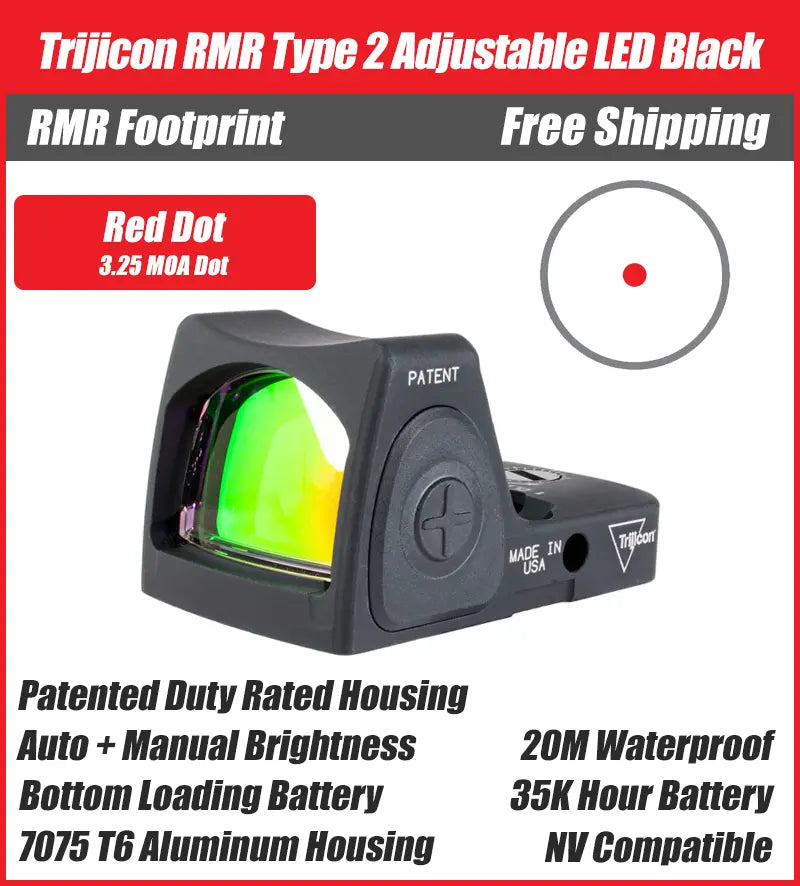 Trijicon RMR Type 2 Adjustable LED Red Dot Sight Black - 7075 T6 Aluminum - Available in 1, 3.25, and 6.5 MOA Versions